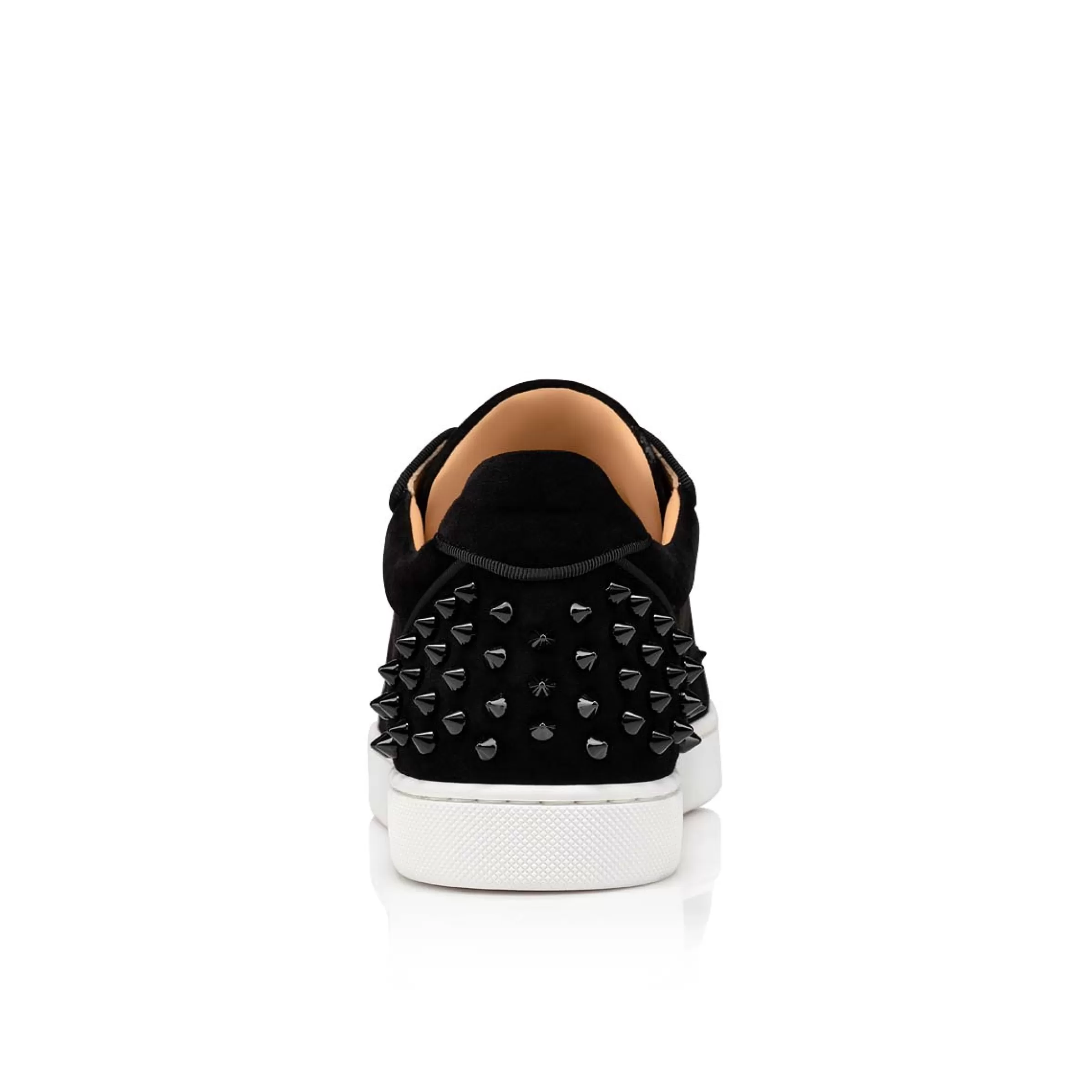 Echoing the style codes of the 1980s tennis shoe, the Vieira 2 is a new twist on a timeless design, showcasing Christian Louboutin’s love of blending textures and materials, for a daring modern effect. This model, in all-over black, features an ultra-soft veau velours, neatly encased with a couture grosgrain ribbon trim. In an audacious twist, the toe and heel are adorned with signature glossy black spikes.